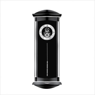 The solid wood case is finished in a satin black. The chrome accents add contemporary flair with a nod to the Art Deco movement. The metal skeleton clock movement has a complementary chrome finish. The swinging tube-style pendulum has a slim profile and is pleasing to the eye. Solid wood case. Satin black finish. Chrome finish details. Curved glass lens. Takes two AA batteries (not included). The solid wood case is finished in a satin black. The chrome accents add contemporary flair with a nod to the Art Deco movement. The metal skeleton clock movement has a complementary chrome finish. The swinging tube-style pendulum has a slim profile and is pleasing to the eye. Solid wood case. Satin black finish. Chrome finish details. Curved glass lens. Takes two AA batteries (not included). ... Read More