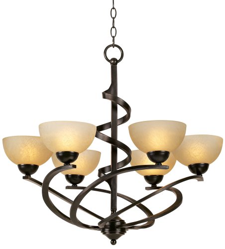 Inspired by classic iron chandeliers, this modern and transitional look features an artfully shaped swirl metal frame. Oil-rubbed bronze finish offsets six amber glass lights. Center column rod with pigtail metal swirl adds a final punctuation mark. From Franklin Iron Works™. Oil rubbed bronze finish. Amber glass. Takes six 60 watt candelabra bulbs (not included). 27 1/2" wide. 26" high. Inspired by classic iron chandeliers, this modern and transitional look features an artfully shaped swirl metal frame. Oil-rubbed bronze finish offsets six amber glass lights. Center column rod with pigtail metal swirl adds a final punctuation mark. From Franklin Iron Works™. Oil rubbed bronze finish. Amber glass. Takes six 60 watt candelabra bulbs (not included). 27 1/2" wide. 26" high. ... Read More