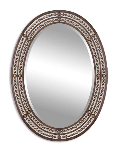 This mirror has a design of concentric ovals interspersed with strings of bead-like forms. The frame is hand forged metal with a distressed oil rubbed bronze finish with antique gold highlights. Design by Uttermost mirrors. Distressed oil rubbed bronze finish with antique gold highlights. Hand forged metal. Uttermost mirrors. 24" wide. 34" high. This mirror has a design of concentric ovals interspersed with strings of bead-like forms. The frame is hand forged metal with a distressed oil rubbed bronze finish with antique gold highlights. Design by Uttermost mirrors. Distressed oil rubbed bronze finish with antique gold highlights. Hand forged metal. Uttermost mirrors. 24" wide. 34" high. ... Read More